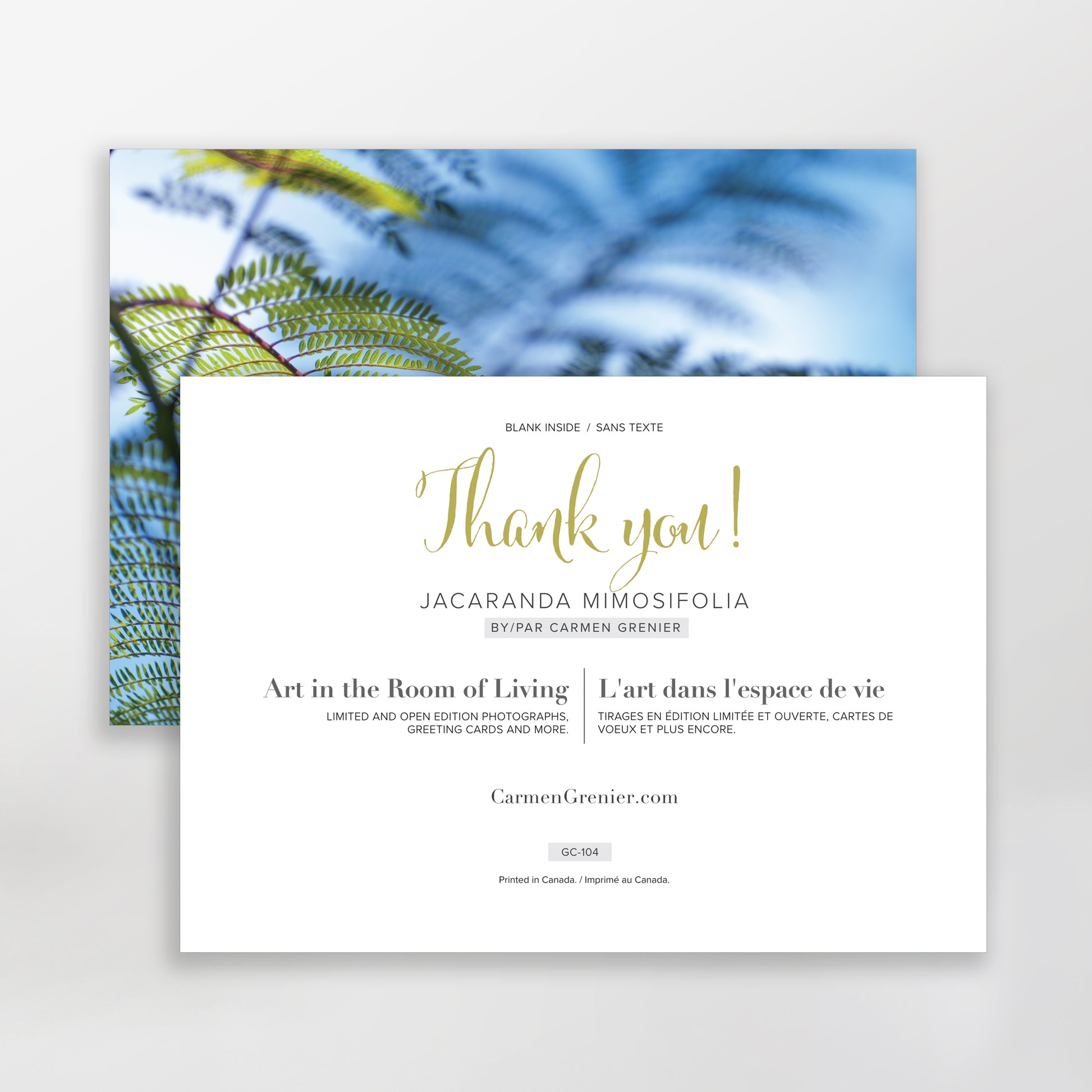 Dites merci avec style grâce à nos magnifiques cartes de vœux Merci! ou Thank you!. Présentant un gros plan des feuilles et des branches d'un magnifique Jacaranda Mimosifolia sur fond de ciel bleu clair, ces cartes sont parfaites pour témoigner de votre reconnaissance de manière élégante et de bon goût.